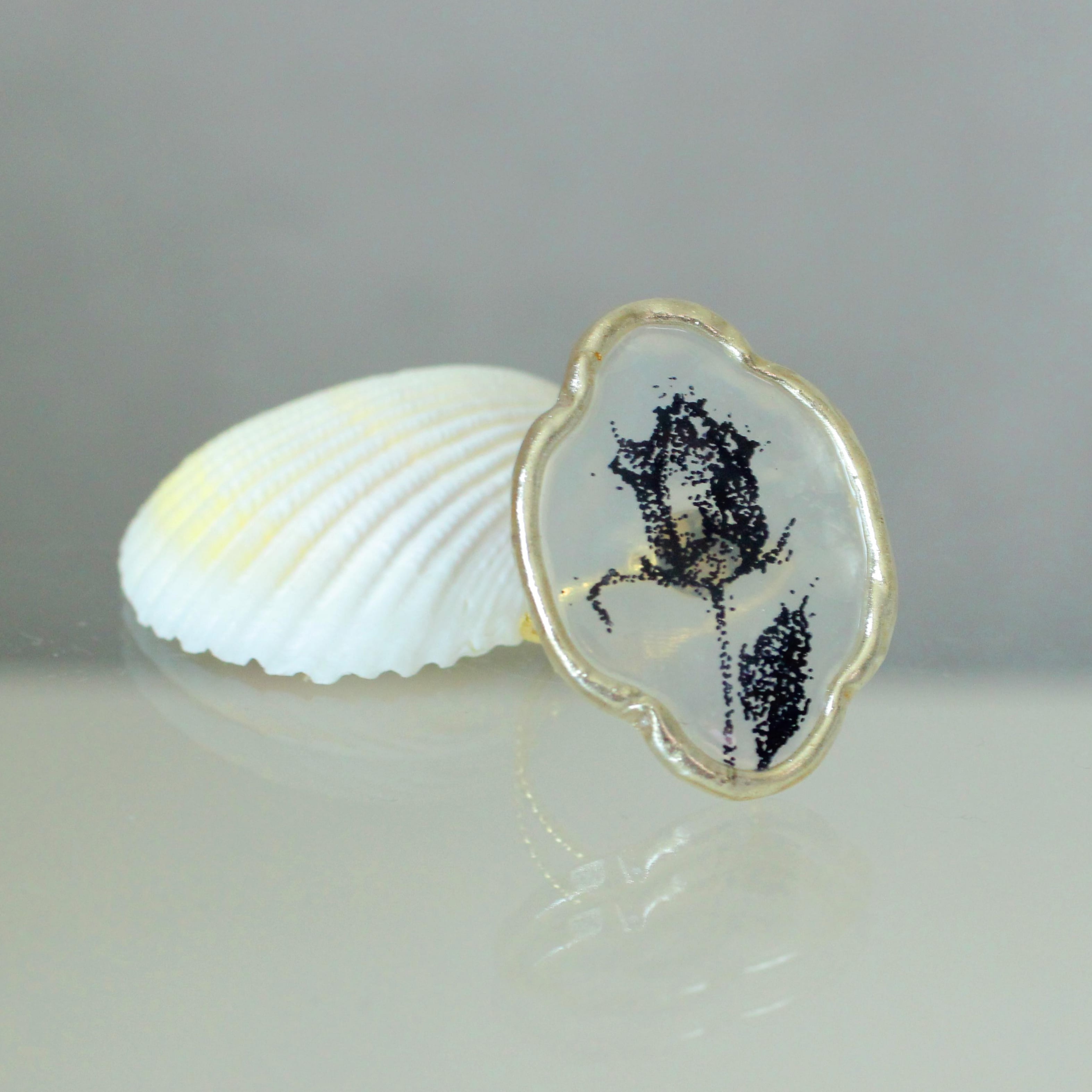 ”カピス”という薄い貝殻をくり抜き、点描でローズを描きました。