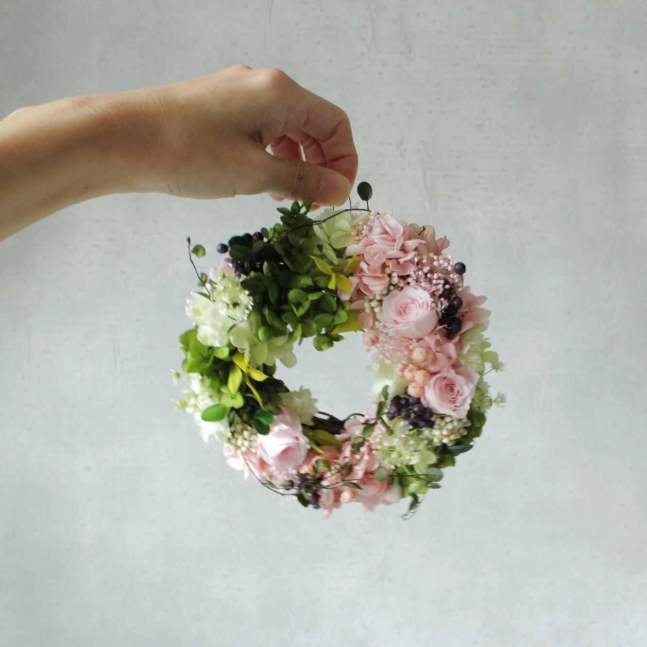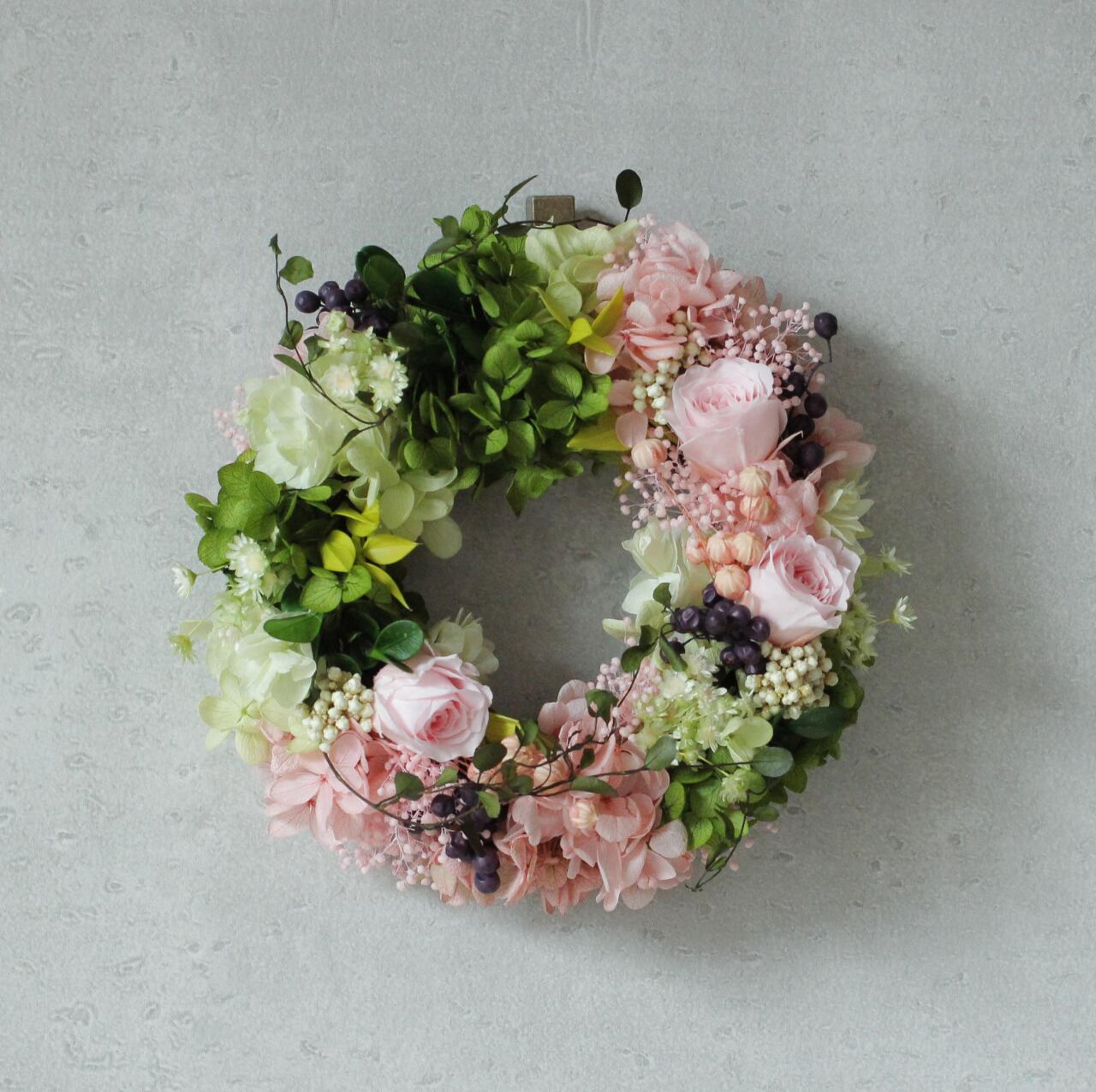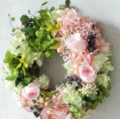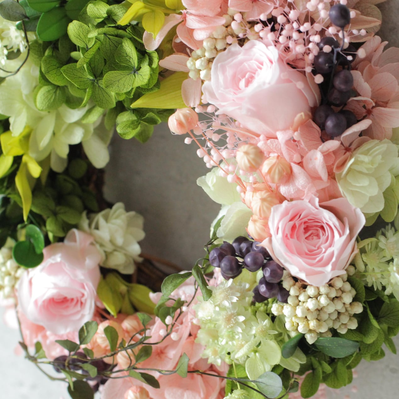 花材:ローズ・アジサイ・カスミソウ・ツゲ・ペッパーベリー・リンフラワー・ライスフラワー・ワイヤープランツ・スターフラワー(プリザーブドフラワー)