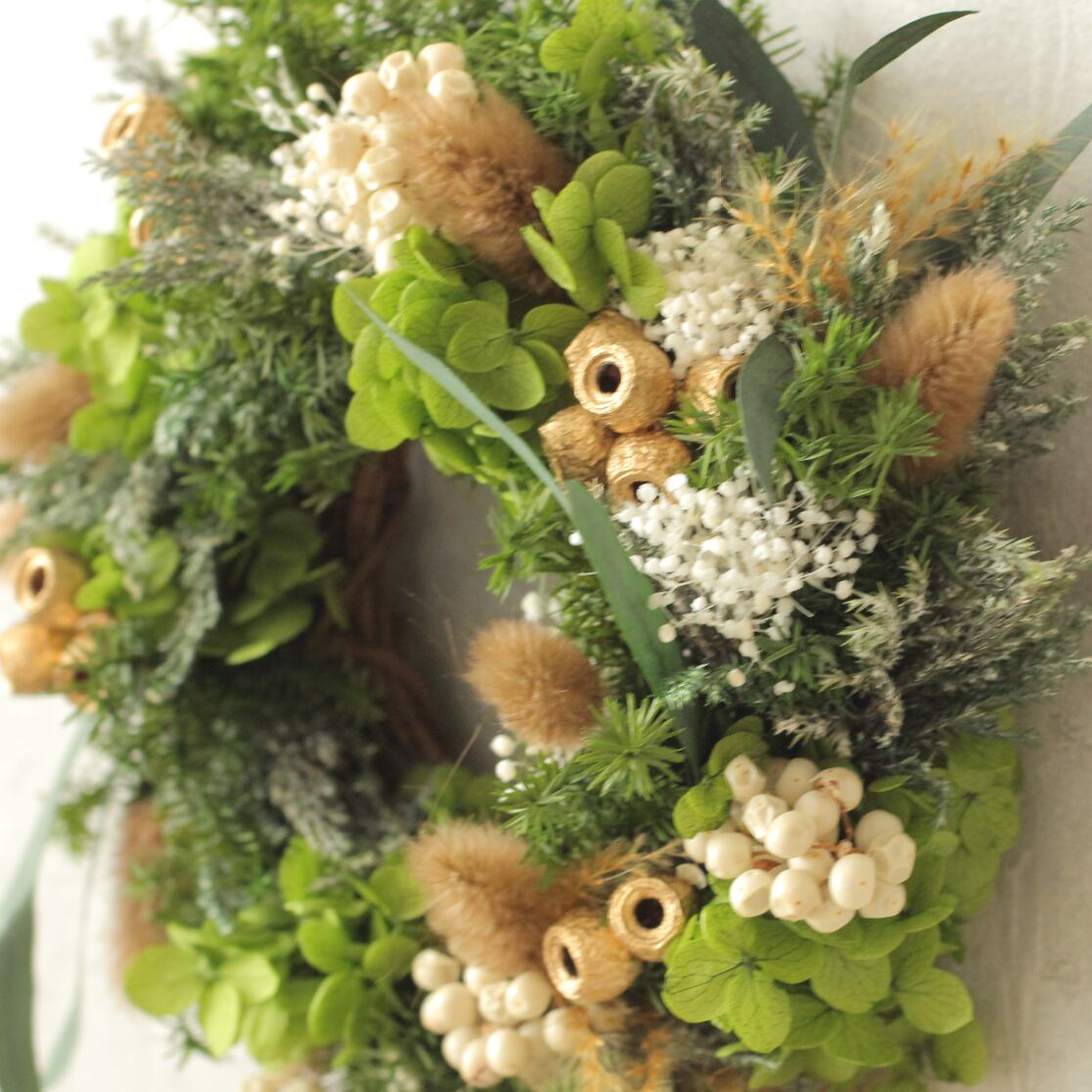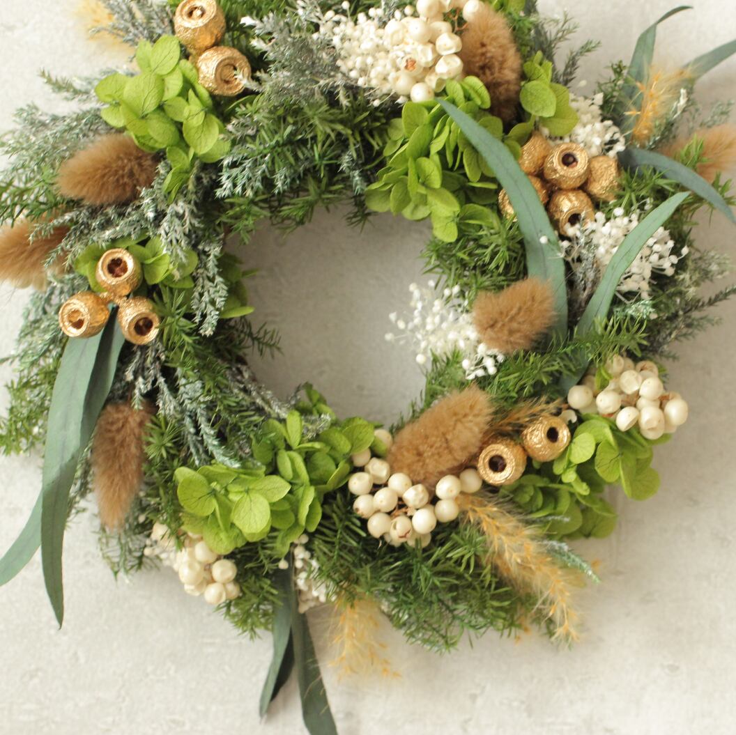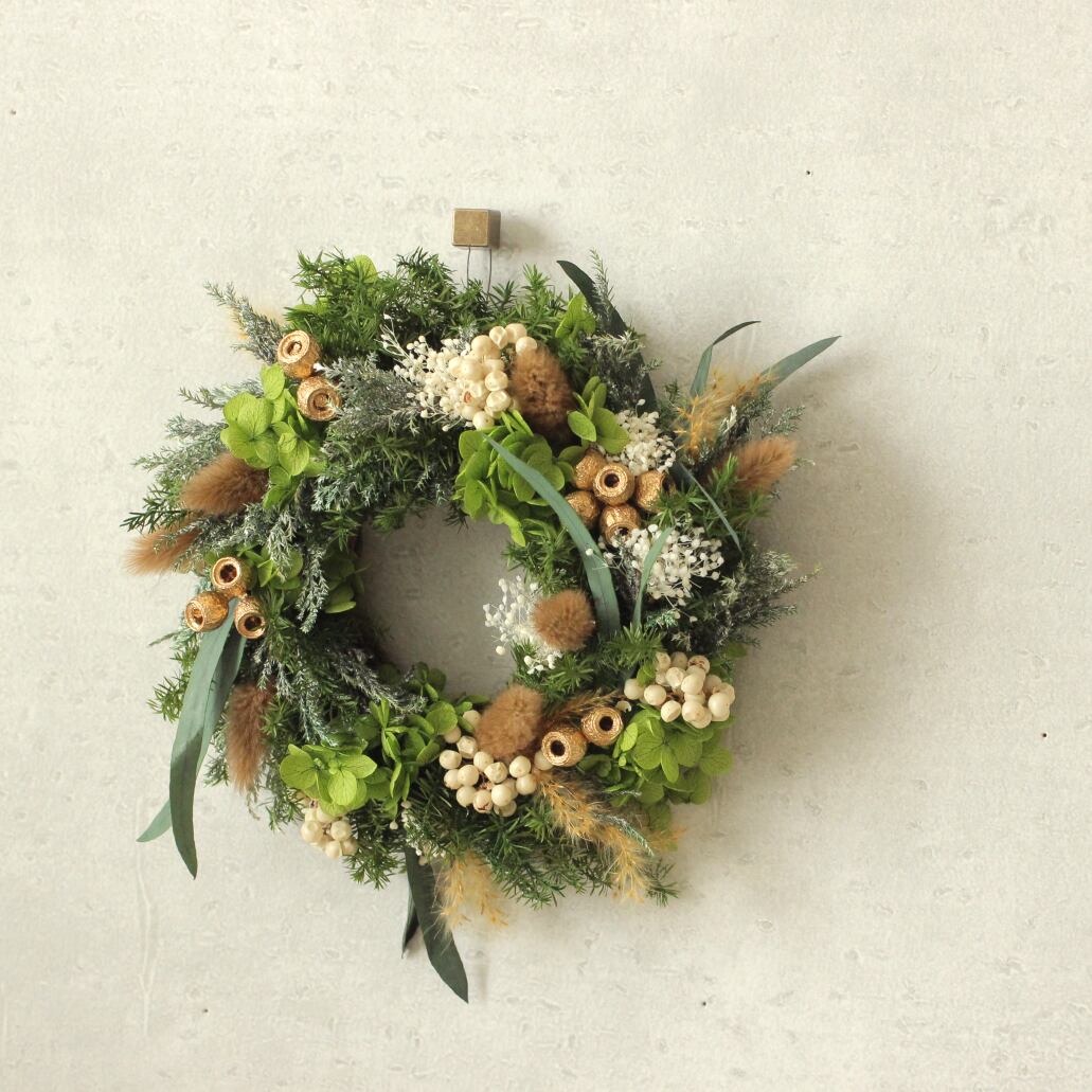 花材:アジサイ・スギ・カスミソウ・ユーカリ・ラグラス・ペッパーベリー・プルームリード・アンバーナッツ・コヒバ・その他(プリザーブドフラワー)