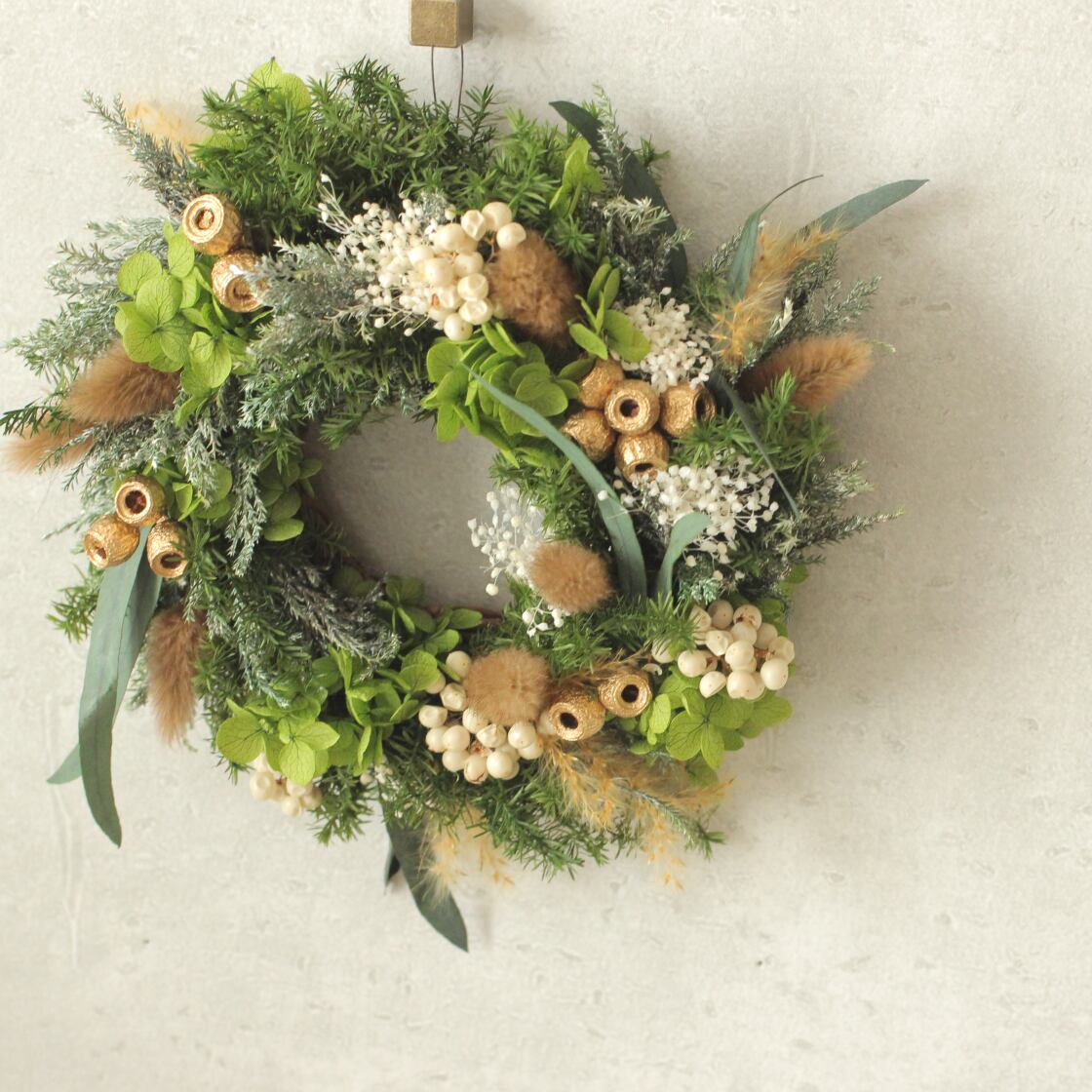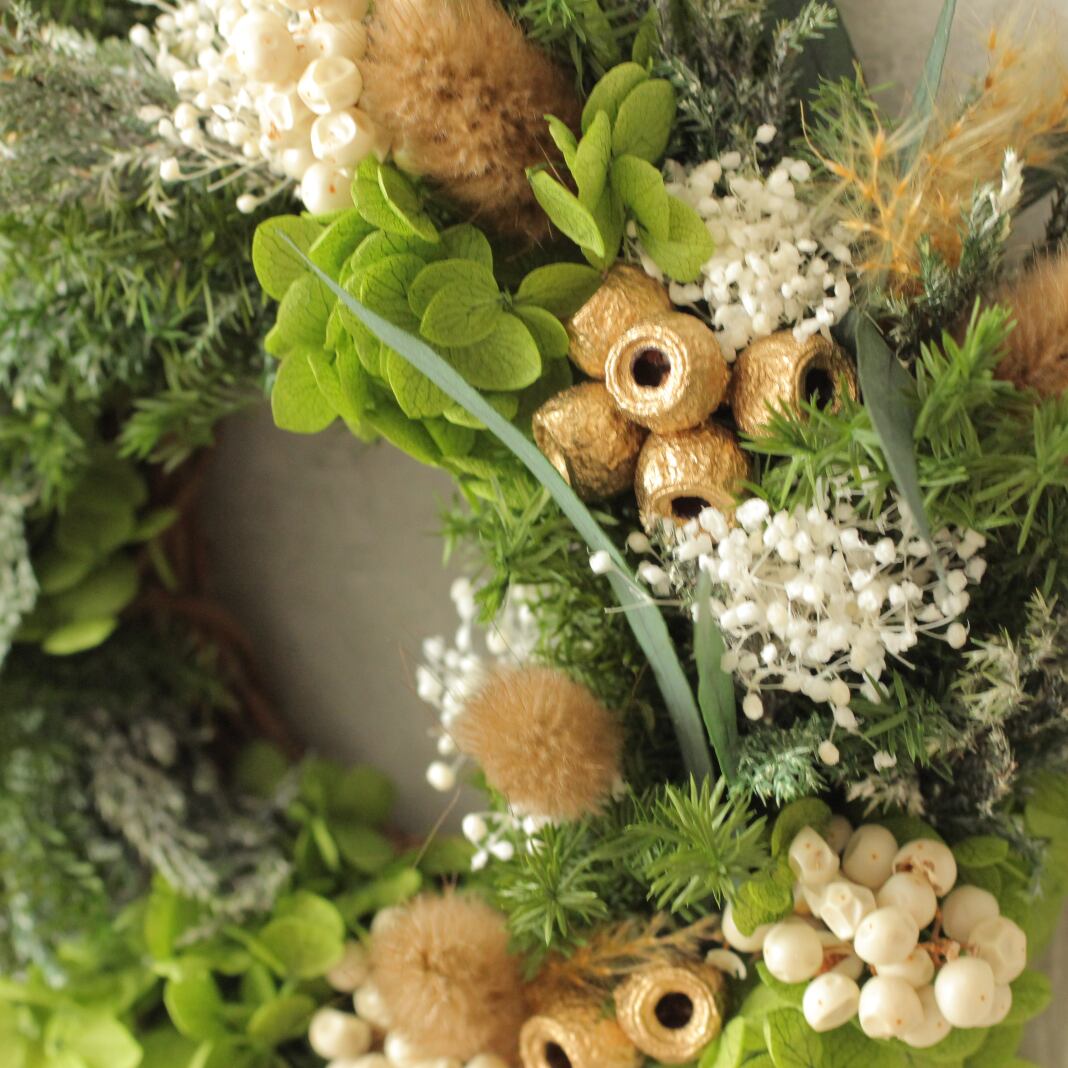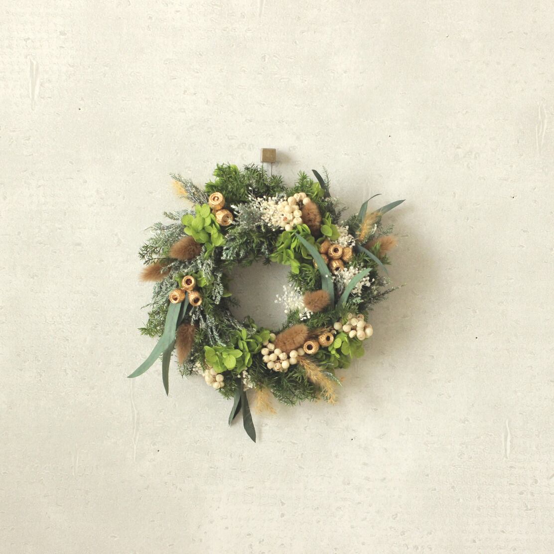 花材:アジサイ・スギ・カスミソウ・ユーカリ・ラグラス・ペッパーベリー・プルームリード・アンバーナッツ・コヒバ・その他(プリザーブドフラワー)